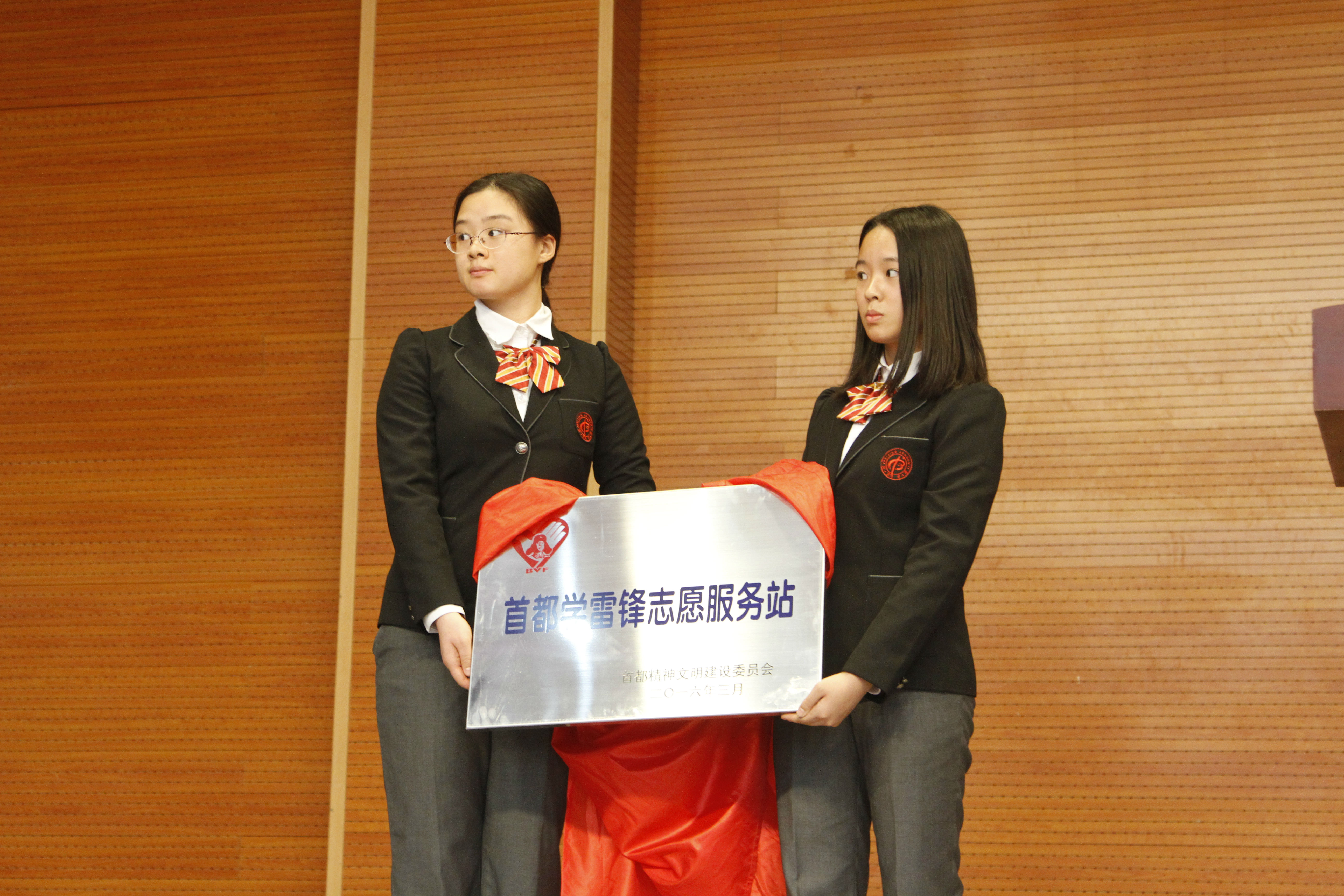 发布会开始后,学委会代表首先对同学们的寒假志愿服务总体情况进行了大数据分析,并对表现突出的同学进行了表彰。其中六年级陆蕙乔、七年级连翔、九年级徐泽惠和江婷同学就自己的寒假志愿服务故事进行了分享。学委会服务部围绕着几位同学的分享,发布了以学生自主建设服务岗位为主题的“X”计划,规范我校志愿服务岗位发布流程。随后,北京市五星志愿者获得者我校八年级学生乔雨筠的发言更是调动起了同学们对志愿服务的热情。北京中学党支部任炜东书记为我校“首都志愿服务站”揭牌并发表简短讲话,鼓励同学们能够“知与行合一、志与愿合一”继续开展更加丰富、深度、有意义的志愿服务活动。学校团委还特别邀请到了星光志愿者协会王蕾老师助力此次发布会,王老师对本学期即将联合开展的颐和园服务项目进行说明,并带领全体学生学习了北京志愿者誓词的精神内涵。团委书记王良老师对学校志愿服务体系进行整体解读。大会最后,主持人带领北京中学全体志愿者进行了庄严的宣誓。