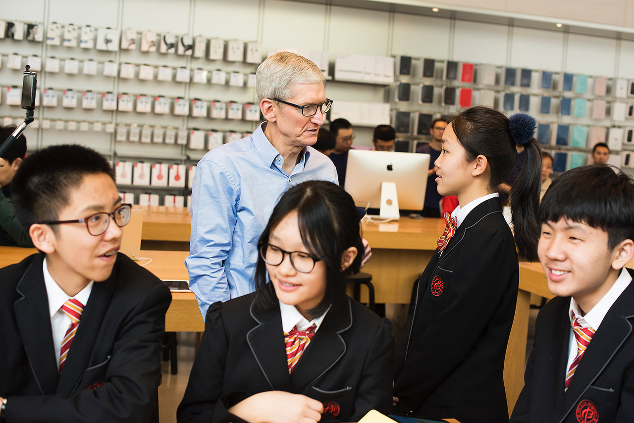 库克先生并没有他平时看上去那样矜持,深邃的眼睛里总能露出和蔼可亲的目光。从来不存在居高临下的感觉,交谈中还会时不时地带一些手势,给人以莫名的亲切感。最初,我跟他交流了一下自己对于苹果手机的看法,从小学四年级开始就一直用苹果手机的我也可以算是对苹果手机情有独钟了吧。后来,在与库克先生简单地谈了谈我对Swift Playgrounds的看法后,我补充道,这么好的编程软件应该将它引入学校的课程啊,库克先生微笑地点着头,答道:“你这个点子给了我一些灵感。”