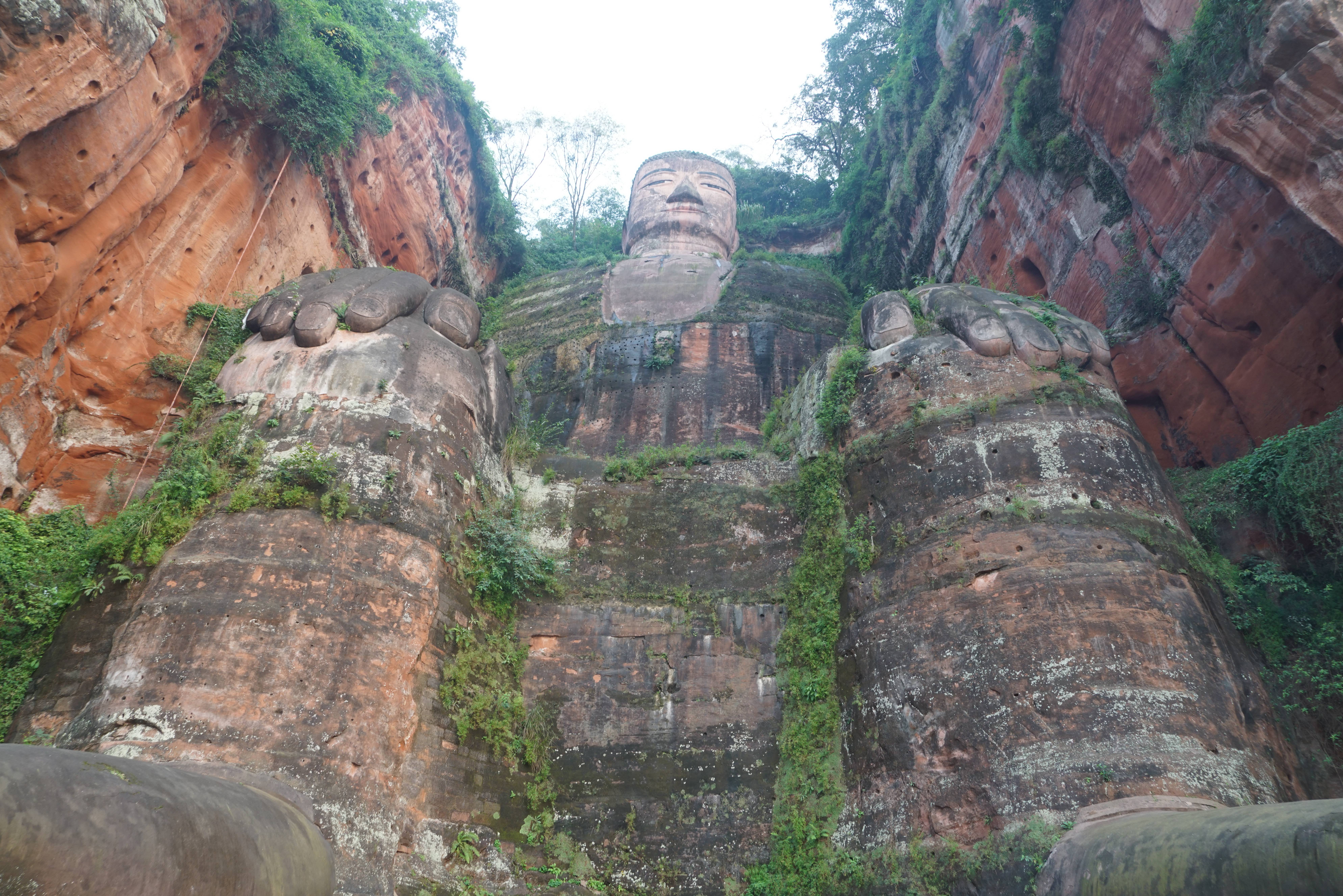 在行走了一段距离以后,同学们只能看到这弥勒佛的头部。但对于从未看到过乐山大佛的同学们来说,这已经是一件十分激动的事。接着往下走,苔藓越发变多,变绿;楼梯越发变窄,变高。但同学们的心情是越发高涨,因为我们能看到的乐山大佛的部分已经越来越多了。从头部,到脖子,到肩膀,到手,到脚。于是当我们来到楼下的平台时,弥勒佛的全身,一览无余。