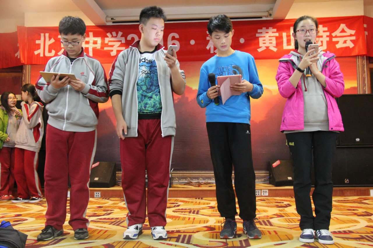 诗会聘请四位语文老师作为评分裁判。整个诗会共分三个环节,分别是“历代黄山名诗巡礼”、“自创诗歌展示”和“即兴楹联创作比赛”。整台活动包括方案预设、活动完善、现场组织、聘请评委和设置奖品,这些都是作为课题由学生自主设计组织的。
