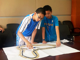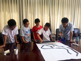 下午,我们在中科院吃了饭,并上了一节关于月球车的课,我们分别从地面和轮胎两个方面进行了三次探究实验,了解了一个月球车要想在月球上行走所需的必要条件。其中最让我们感兴趣的便是关于地面的实验了。我们在已经在用黑胶带铺出一条路的白纸上洒满了沙子,拿手把沙子铺成高低起伏的样子,以模仿月球上的丘陵,再把月球车放到上进行行走,当看到我们的月球车历经艰辛的走完了全程,我们激动的击了一下掌以表祝贺。随后记下了数据。
