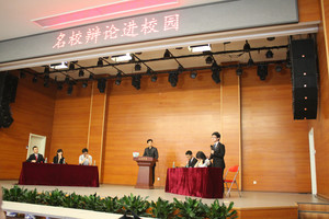 第一场中学生辩论,正反双方的资料很充足也很有利,据说他们周六的时候还去采访了,好认真啊,值得我们去学习!正反双方主要就三点展开了辩论:一、资源(如学术氛围、图书馆资源、师资力量);二、环境(如食堂、宿舍);三、成绩(如毕业平均分)。听了他们的辩论,我觉得清华和北大真是各有特色,比如清华的食堂有二十多个,里面的伙食好得都让学生发愁明天要吃什么了,清华的学生宿舍也超级棒,还有就是清华注重务实严谨,管理严格,他们的校训是:自强不息,厚德载物。北大的话,会相对来说自由一些,而且北大的图书馆是一个宝。在这两所名校中曾发生了一件特别有意思的事:北大的学生成立了一个协会,每天中午这个协会的人就骑着自行车去清华吃饭。这本来是正方用来打击反方的论点,但是后来评委点评时时,说这个点有两方面的含义,一方面是说清华的伙食好,而另一方面则是说北大很自由(自由到能学生能自己成立一个协会,去别的学校吃饭)。看来以后论点一定要考虑全面后再拿出来辩!
