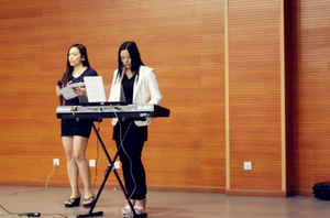 最后,一首活泼而又透着热情的英文歌带动了全场的所有人。三个年级,240个人的声线巧妙的合在了一起,构成了一首完美的乐曲。而不得不说Johnny唱歌真的是十分的好听,将报告厅里的所有人与物全部渲染,沉迷于那富有磁性的嗓音。