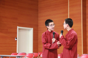 令我印象最深的是一段具备专业水准的相声。两个身穿暗红色长大褂的学长一上台就令人眼前一亮。只是一段“请客吃饭”的简单对话,却被他们说出了新花样。凭借着三寸不烂之舌,他们在舞台上舌绽莲花,赢得台下一片叫好声。最后,他们以一段经典的“报菜名”再次博得了满堂彩。